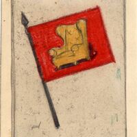 Sobre un fondo claro y en posición inclinada se toma como motivo principal en este dibujo enmarcado una bandera con su tela de fondo rojo y un sofá amarillo dibujado en el centro. Hacia la derecha inferior se vislumbra el boceto de la firma del pintorBoceto realizado para la ilustración de la revista semanal Novelas y Cuentos. Titulo: La Oca y los extremeños se tocan. Autor: Pedro Muñoz Seca. Nº publicado: 959. Fecha: 25-09-1949. Tomo NC. 5