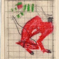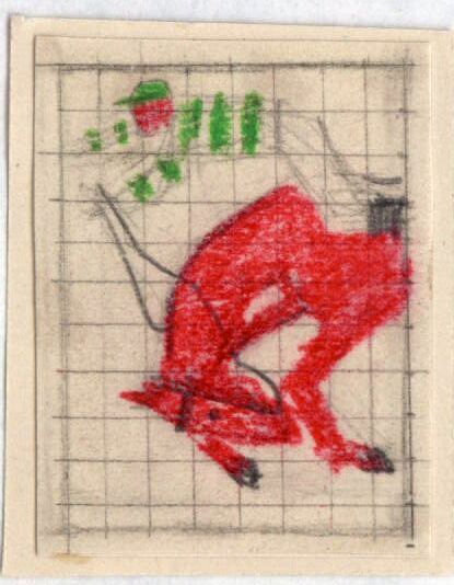 En una hoja cuadriculada se puede apreciar la figura de un caballo rojo, del que apenas se ven su cabeza y su cuello, tirando en un movimiento brusco al jinete, que sale volando por los aires. Su camiseta es a rayas blancas y verdes, su pantalón blanco y su gorra verde.Boceto realizado para la ilustración de la revista semanal Novelas y Cuentos. Titulo: El hombre gris. Autor: Edgar Wallacer. Nº publicado: 1297. Fecha: 18-03- 1956. Tomo Nc.: 36.