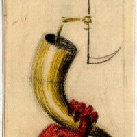- Un gran cuerno en tonos amarillentos es cogido por una mano roja. Del interior del cuerno sale la imagen de un brazo esquelético sosteniendo una guadaña. El formato del soporte es rectangular.Boceto realizado para la ilustración de revista Novelas y Cuentos: Titulo: Hernani. Autor: Victor Hugo. Nº public. 1134. Fecha 01-02-1953 Tomo NC. 58 Prueba Imprenta: 200
