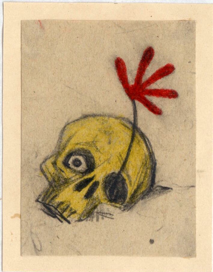 - Sobre el suelo yace una calavera amarilla, de se asoma, en su lado derecho, un impresionante ojo. De su ojo izquierdo crece una flor de enorme tallo y pétalos rojos. La imagen del dibujo está enmarcada.Boceto realizado para la ilustración de la revista semanal Novelas y Cuentos. Titulo: Autor: Nº publicado: Fecha: Tomo Nc.: