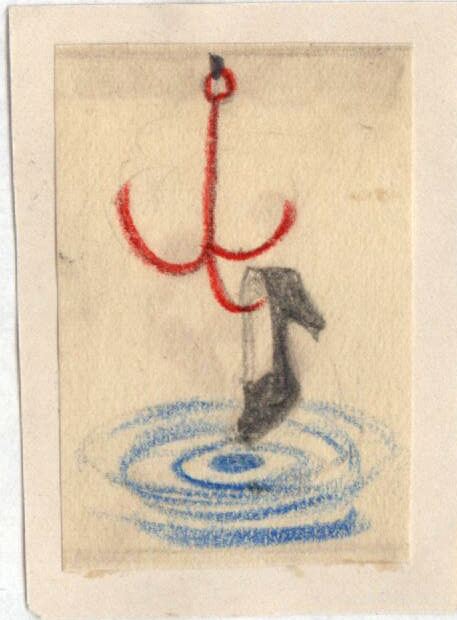 Un anzuelo grande y rojo que surge de la parte superior del dibujo rescata de las aguas, formadas por círculos azules, un zapato de mujer de color negro. La escena del dibujo se halla enmarcada.Boceto realizado para la ilustración de la revista semanal Novelas y Cuentos. Titulo: La mujer en el umbral. Autor: Warmick Deeping . N º publicado: 1317. Fecha: 05-08-1956. Tomo NC.: 28.