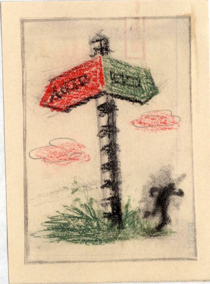 Clavado en un suelo de hierbas un poste de señalización señala dos caminos hacia la derecha con una flecha roja y hacia la izquierda con una flecha verde. En cada flecha hay una palabra inscrita de difícil percepción. Por el camino de la izquierda un hombre emprende su carrera. El dibujo se encuentra enmarcado.Boceto realizado para la ilusgtracion de la revista semanal Novelas y Cuentos. Titulo: La Fiera en acecho. Autor: Valentine Willians. Nº publicado: 946. Fecha: 26-06-1949. Tomo NC.: 3