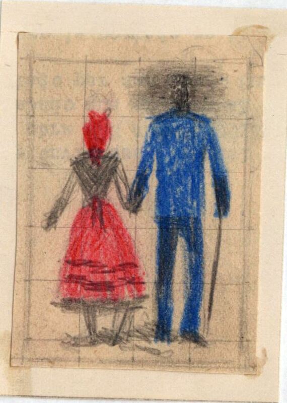 La figura de dos enamorados cogidos de la mano y de espaldas es el motivo de este dibujo sobre una superficie cuadriculada. El hombre, alto, lleva un traje azul. La chica, más bajita, lleva una falda roja al igual que el pañuelo de su cabeza y un chal negro sobre la espalda.Boceto realizado para la ilustración de la revista semanal Novelas y Cuentos. Titulo: Marianela. Autor: Alvarez Quintero. Nº publicado: 1154. Fecha: 26-06-1953. Tomo NC. 46.