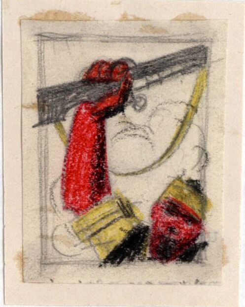El tema de este dibujo enmarcado es la figura de un soldado del que se ve su cara y un brazo levantado empuñando una escopeta. Su piel es roja oscura y lleva una camiseta amarilla con un chaleco negro. Sobre su cabello oscuro lleva una cinta amarilla al estilo indio.Boceto realizado para la ilustración de la revista semanal Novelas y Cuentos. Titulo: Autor: Nº publicado: Fecha: Tomo NC.: