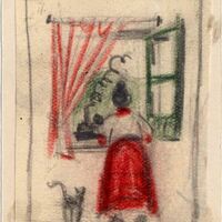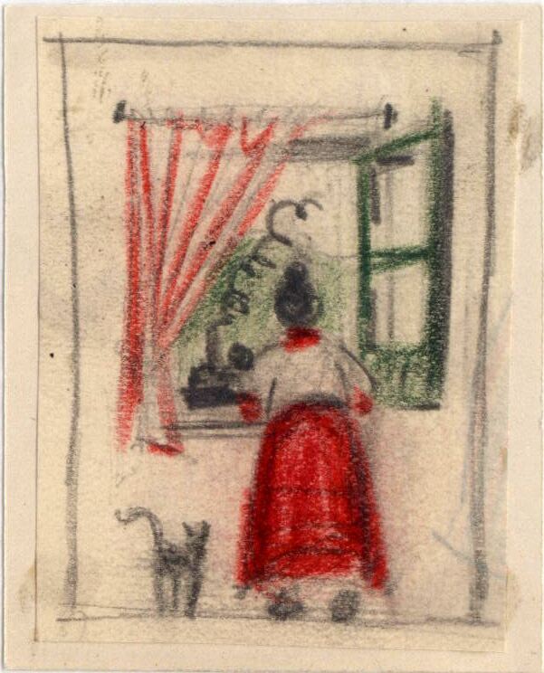 Enmarcada la escena de esta imagen vemos en ella a una mujer de espalda con camisa blanca, falda de vuelo roja y el pelo negro recogido en un moño mirando por la ventana verde con una cortina roja hacia un jardín. A su lado derecho la acompaña un gato gris. Al fondo se observa como una maquina o un buque echando humo por la chimenea.Boceto realizado para la ilustración de la revista semanal Novelas y cuentos. Titulo: La Caraba. Autor: Muñoz Seca y Pérez Fernández. Nº publicado: 1237. Fecha: 23-01-1954. Tomo NC.: 60.