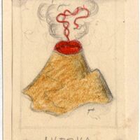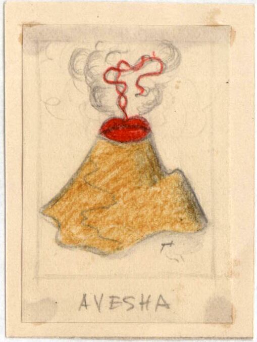 En este dibujo ligeramente enmarcado en el que se incluye una inscripción con la palabra “Avesha” vemos la figura de un volcán de aspecto amarillento en erupción. De su orificio se ve la lava de color rojo y el humo por el efecto del calor con la forma de líneas rojas y grises. El artista ha firmado su obra.Boceto realizado para la ilustración de la revista semanal Novelas y Cuentos. Titulo: Avesha. Autor: H. Rider Haggard. Nº publicado: 1097. Fecha: 18-05-1952. Tomo NC.: 25