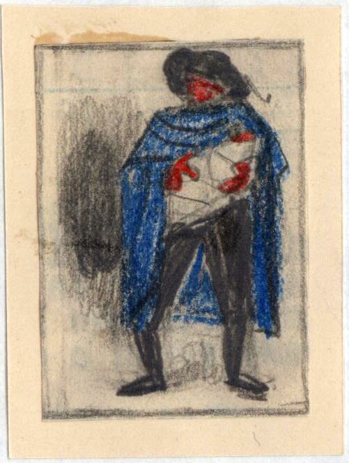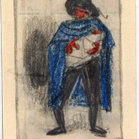 Sobre un fondo algo oscuro y ligeramente cuadriculado un hombre de pie vestido de negro, con sombrero y una larga capa azulada sostiene en sus brazos un bebé envuelto en una tela blanca.Boceto realizado para la ilustración de la revista semanal Novelas y Cuentos. Titulo: El sacristan de las monjas. Autor: Pedro Escamilla. Nº publicado. 1021. Fecha: 03-12-1950. Tomo NC.: 52