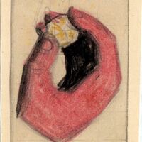 El escenario de este dibujo enmarcado está centrado en la imagen de una mano rosada que se encuentra cogiendo entre sus dedos una piedra pequeña y amarilla. El fondo del dibujo es ligeramente cuadriculado.Boceto realizado para la ilustración de la revista semanal Novelas y Cuentos. Titulo: El Gran Diamante. Autor: V. W. Tackeray. N º publicado: 909. Fecha: 10-10-1948. tomo NC.: 16