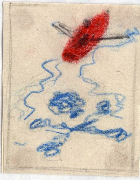 Una barca pequeña y roja llevada por un hombre navega sobre las aguas de un lago en las que se refleja el símbolo de la muerte: la calavera y dos huesos cruzados en color azul.Boceto realizado para la ilustración de la revista semanal Novelas y cue ntos. Titulo: Fanatismo de amor. Autor: Howard Spring. N º publicado: 1337. Fecha: 23-12-1956. Tomo NC.: 28.
