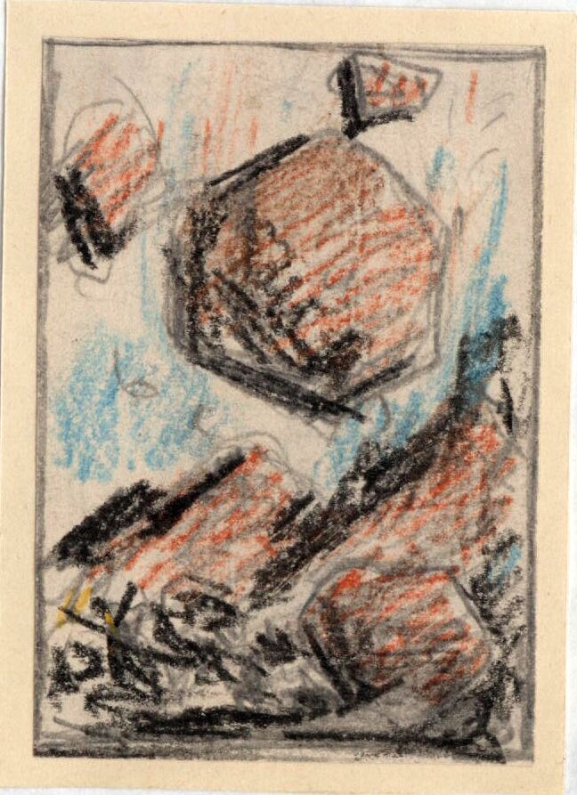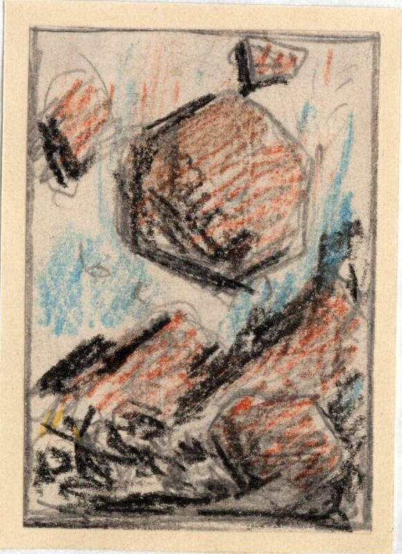 De un cielo azulado caen rocas rugosas de un gran tamaño depositándose en la tierra rocosa. No podemos, de momento, determinar exactamente lo que representa. El dibujo está enmarcado.Boceto realizado para la ilustración de la revista semanal Novelas y Cuentos. Titulo: Kowa la misteriosa. Autor: Charles Foley. Nº publicado: 807. Fecha: 27-10-1946. Tomo NC. 18