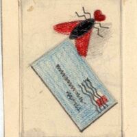 Una mosca de cuerpo negro, con sus alas y cabeza rojas, y un sobre azul son los motivos que componen esta escena enmarcada. Ambas figuras se hallan encima una de la otra.Boceto realizado para la ilustración de la revista semanal Novelas y Cuentos. Titulo: Mosquita en Palacio. Autor: Adolfo Torrado. Nº publicado: 1121. Fecha: 02-11-1952. Tomo NC. 43