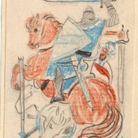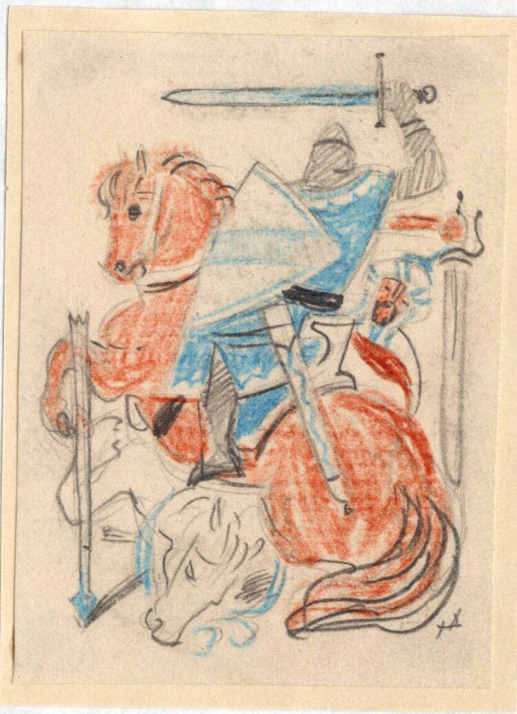 En este dibujo firmado por su autor se muestra una batalla medieval en donde un guerrero con su armadura y su túnica blanca y azul monta su caballo empuñando su espada y luchando contra sus enemigos.Boceto realizado para la ilustración de la revista semanal NovelAS Y Cuentos. Titulo: El Romance de Rolando. Autor: Anónimo. Nº publicado: 951. Fecha: 31-07-1949. Tomo NC. 19.