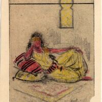 En el escenario de las mil y una noches, sobre unos almohadones amarillos y a rayas negras y rojas, descansa una muchacha del harén de un sultán árabe. Sus cabellos sueltos son negros como la noche y su traje es amarillo. Destaca en la composición un ventanal de características árabes cuyo fondo es amarillo. En la parte superior del dibujo enmarcado destaca una línea oscura en posición horizontal. Se puede apreciar, también, la firma del pintor.Boceto realizado para la ilustración de la revista semanal Novelas y Cuentos. Titulo: Autor: Nº publicado: Fecha: Tomo NC.