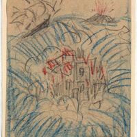 - De las aguas azules del mar, que se abren, dejan en su centro un pequeña cavidad donde crece una aldea y a su alrededor una barco navega. A lo lejos un volcán entra en erupción.Boceto realizado para la ilusgracion de la revista semanal Novelas y Cuentos. Titulo: Autor: Nº publicado: Fecha: Tomo NC.