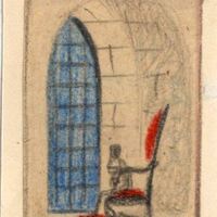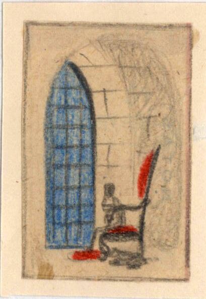 En una habitación con sus paredes de piedra hay una gran silla roja cercana a una ventana enorme dividida por sus rejas en numerosos cuadraditos. En dicha silla una figura humana está sentada mirando hacia el ventanal apreciando las vistas. Un fondo azul se deja adivinar por la transparencia del cristal. El dibujo se encuentra enmarcado.Boceto realizado para la ilustración de la revista semanal Novelas y Cuentos. Titulo: El reyecito. Ajutor: Andres Lichtenberger. Nº publicado: 1012. Fecha: 01-10-1950. Tomo NC.: 49