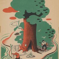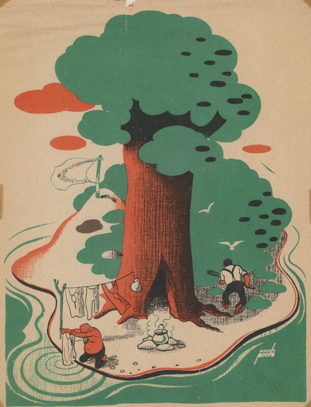 Sobre las aguas verdes del mar destaca la imagen de una isla en al que hay verdes árboles y en la que viven dos hombres. Uno de ellos tiende la ropa y el otro se dedica a cazar con una escopeta. Sobre las aguas del mar se vislumbra la firma del pintor, como puede verse en el lado izquierdo.Prueba de imprenta. Ilustración realizada para la revista semanal de Novelas y Cuentos. Titulo: Autor: Nº publicado: Fecha: Tomo NC.