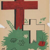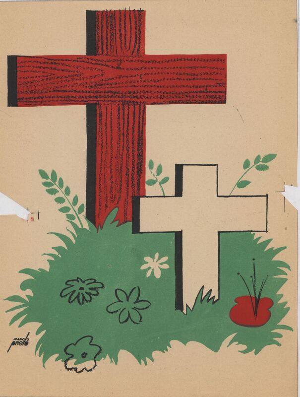 - Dos cruces, una blanca de un tamaño pequeño y otra marrón más grande que la anterior, se encuentran entre plantas verdes y flores. En la composición destaca la firma del pintor como puede apreciarse en el lado derecho.Prueba de imprenta. Ilustración realizada para la revista semanal de Novelas y Cuentos. Titulo: Autor: Nº publicado: Fecha: Tomo NC.