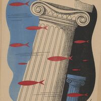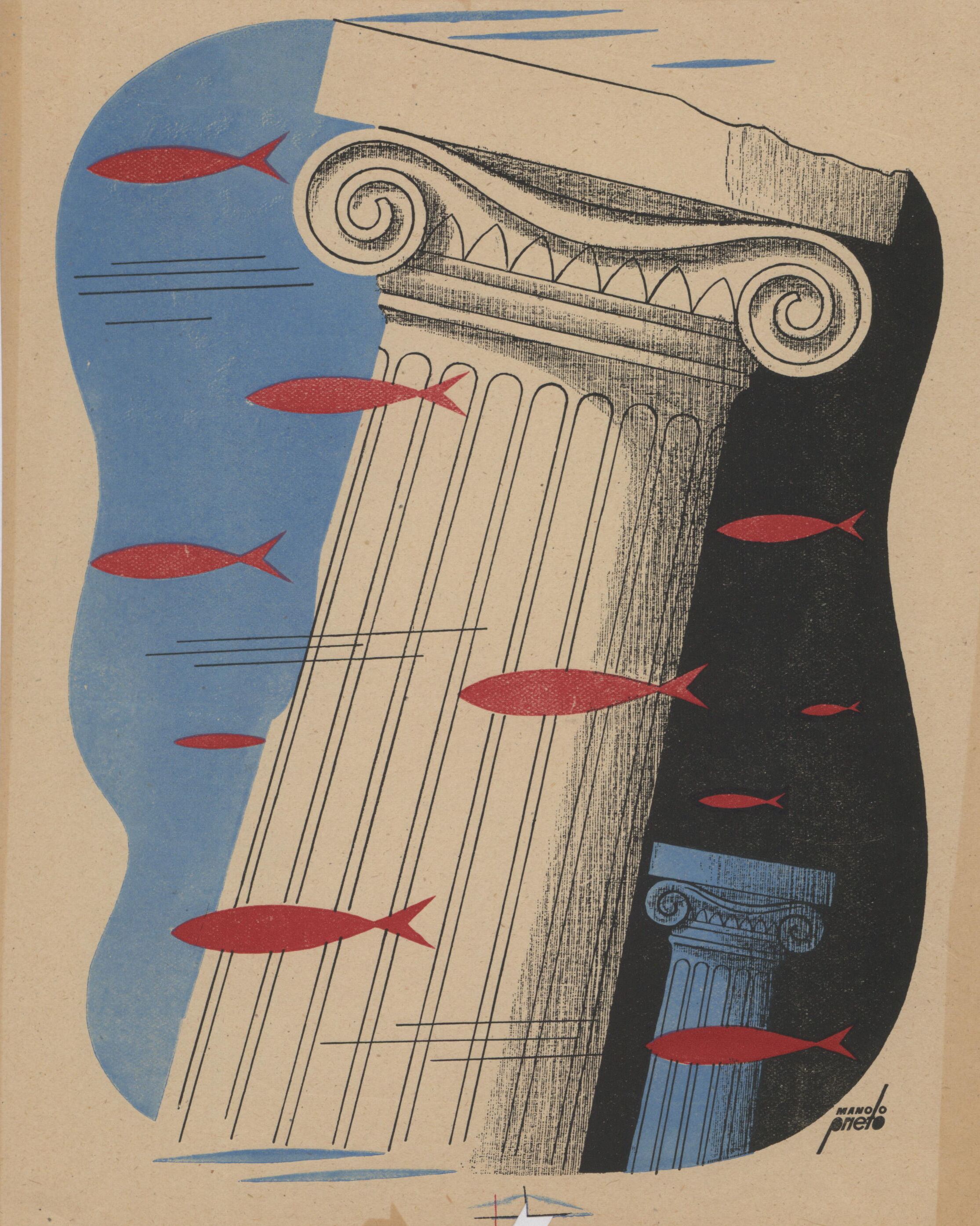 En el fondo de las aguas azules y negras del mar, en el que viven peces rojos y demás especies, se hallan alguna columnas de estilo clásico para siempre sepultadas. En el dibujo está presente la firma del pintor.Prueba de imprenta. Ilustración realizada para la revista semanal de Novelas y Cuentos. Titulo: Atlantida. Autor: Hans Dominik. Nº publicado: 916. Fecha: 28-11-1948. Tomo NC.: 2