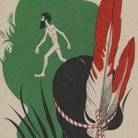 Sobre un fondo verde pasea un hombre extremadamente flaco, desnudo y con la piel muy blanca. En segundo plano, un indio, de espalda y del que solamente se ve su cabeza de negros cabellos adornados con una cinta y plumas blancas y rojas, observa a la extraña criatura que camina desnuda. El dibujo está firmado.Prueba de imprenta. Ilustración realizada para la revista semanal de Novelas y Cuentos. Titulo:Naufragios Autor: Nuñez Cabeza deVaca; Nº publicado:901; Fecha: 15-08-48;Tomo C.: 02 -Revista Si; boc. 88