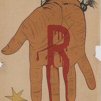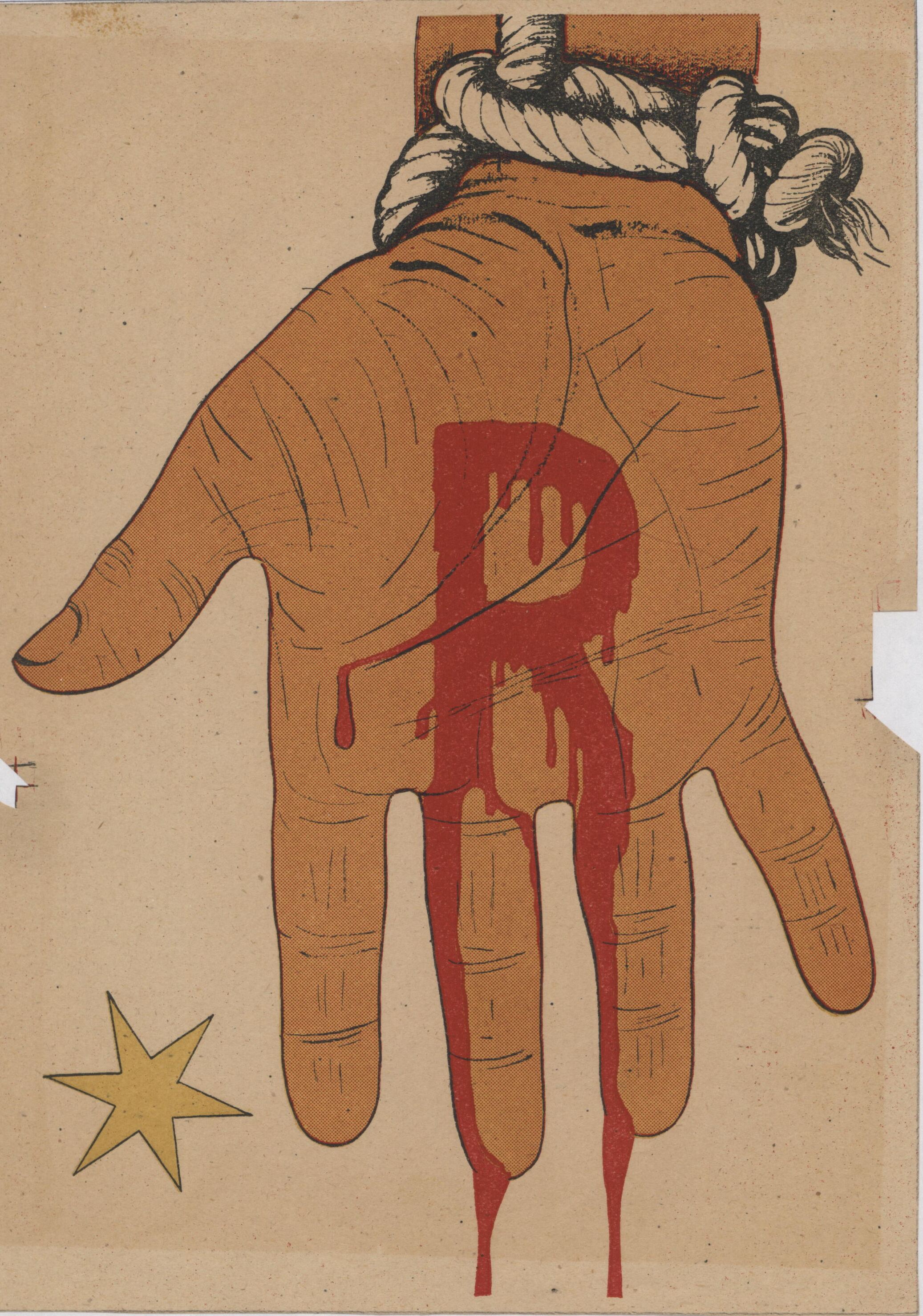 Una mano abierta con una cuerda atada en su muñeca muestra una “R” grabada en sangre en su palma Abajo del dibujo en segundo plano aparece una estrella de cinco puntas amarilla. La composición está firmada.Prueba de imprenta. Ilustración realizada para la revista semanal de Novelas y Cuentos. Titulo: Unos pasos de mujer. Autor: W. Fernández Flórez. Nº publicado: 921. Fecha: 02-01-1949. Tomo NC.: 11.