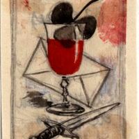 Cuatro elementos se hallan en la escena de este dibujo enmarcado: una copa de cristal llena de vino hasta la mitad, un puñal y, por detrás de la copa, un sobre sellado. Encima de la copa un trébol de tres hojas.Boceto realizado para la ilustración de la revista semanal Novelas y Cuentos. Titulo: La maldición de Siva. Autor: W. Chesney. Nº publicado: 836. Fecha: 08-05-1947. Tomo NC 11.