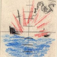 Sobre un fondo claro se disponen dos líneas negras, una en vertical y otra en horizontal, formando una cruz. Alrededor se disponen sin seguir un orden ni formando figuras precisas colores azules, rojos y negros. En primer término aparece el visor de un periscopio y al fondo la explosión de un barco como se le hubiesen disparado un torpedo.Boceto realizado para la ilustración de la revista semanal Novelas y Cuentos. Titulo: Autor: Nº publicado: Fecha: Tomo NC.
