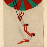 - Un abanico abierto a rayas verdes y rojas ocupa toda la parte inferior del dibujo enmarcado. Dos trapecistas, hombre y mujer, ayudados por una escalera, hacen su número por los aires. Su traje es blanco.
