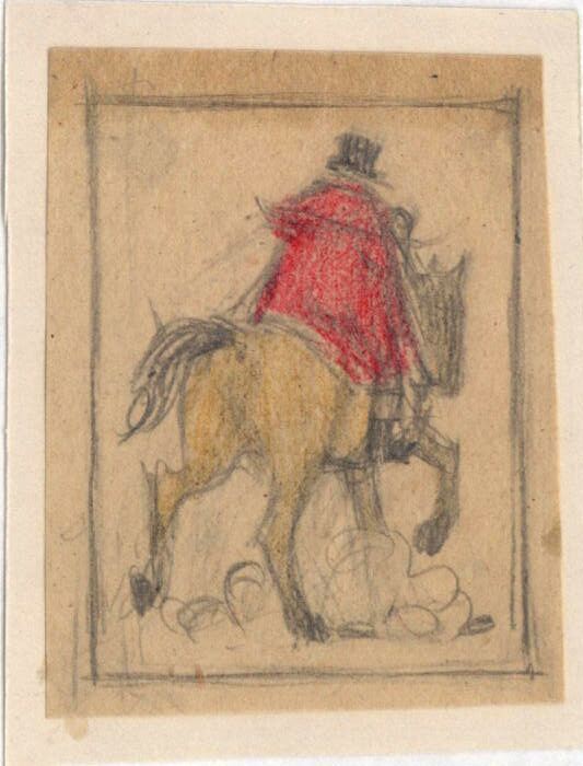 En este dibujo encuadrado se ve de espalda un jinete con capa roja y sombrero negro sobre un caballo castaño claro al galope. A su paso va soltando una polvareda representada mediante líneas ondulantes de color grisáceo.Boceto realizado para la ilustración de la revista semanal Novelas y Cuentos. Titulo: Guy Manhering o El Astrologo. Autor: Walter Scott. Nº publicado: 1334. Fecha: 02-12-1956. Tomo NC. 34.