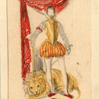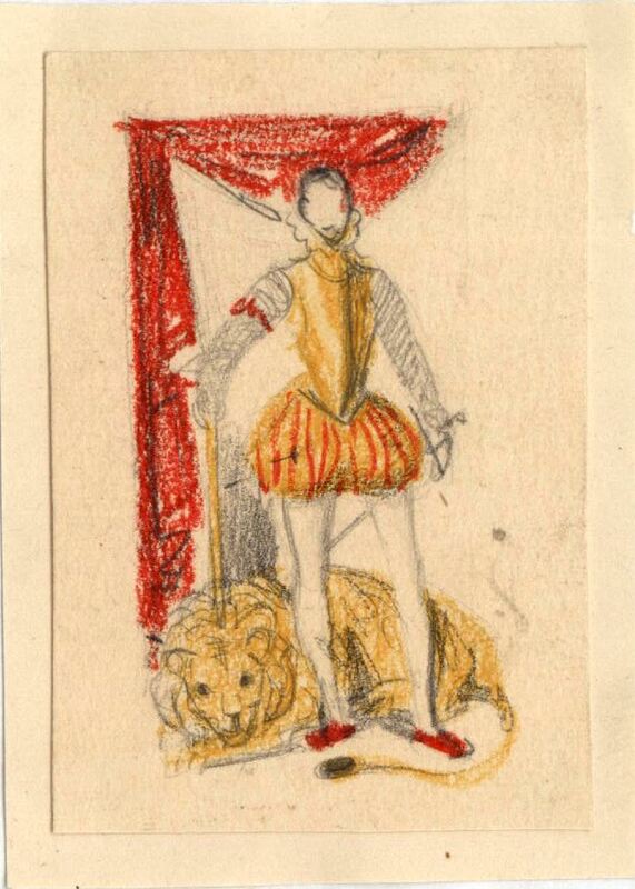 Como si de un retrato se tratase se ha representado a un aristócrata en pie con los brazos caídos a lo largo del cuerpo con sus pantalones abombados de color amarillo al igual que la chaqueta, con sus medias blancas y zapatos rojos. A sus pies, más atrás, un león amarillo le acompaña. Como escenario de fondo destaca una gran cortina roja cogida elegantemente al estilo palaciego.Boceto realizado para la ilustración de la revista semanal Novelas y Cuentos. Titulo: D. Juan de Austria (El Caudillo de Lepanto). Autor: J. Martinez Sierra. Nº publicado: 1117. Fecha: 05-10-1952. Tomo NC. 31.