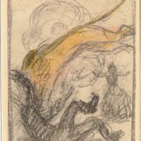 - Una mujer pide socorro al ver que un león se ha tirado encima de su marido. El león es de color amarillo mientras que las dos figuras humanas son de color blanco y negro. El dibujo está enmarcado.Boceto realizado para la ilustración de la revista semanal Novelas y Cuentos. Titulo: Autor: Nº publicado: Fecha: Tomo NC.