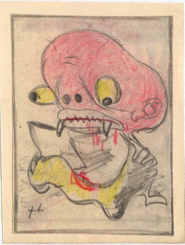En este dibujo enmarcado que el pintor ha firmado se representa a una extraña figura sentada con la cabeza enorme de color rosa. También son de grandes proporciones sus ojos amarillos y su boca de la que salen extensos y afilados dientes. Su cuerpo amarillo, sin embargo, es más pequeño.Boceto realizado para la ilustración de la revista semanal Novelas y Cuentos. Titulo: El ajedrez vivo de Marte. Autor: Edgar Rice Burroughs. Nº publicado: 998. Fecha: 26-06-1950. Tomo NC. 47.