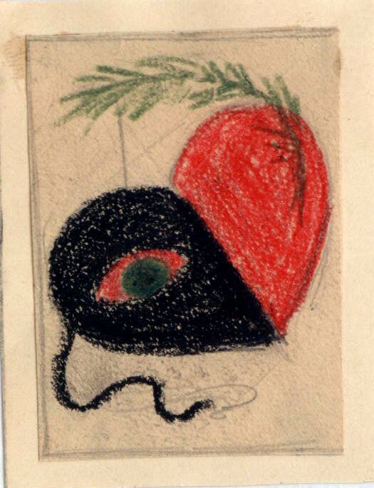 Escena en la que se aprecia un gran corazón dividido en dos partes. La parte izquierda del corazón es de color negro donde está dibujado un ojo y la parte derecha es de color rojo en donde aparece el dibujo de una rama en tonos verdes. El dibujo está enmarcado con lápiz.Boceto realizado para la ilustración de la revista Novelas y Cuentos: Titulo: El Apache; Autor: Paul Bourget; nº publicación: 1.079; Fecha: 13-01-1952; Tomo NC/ 42; Prueba de Imprenta nº 106