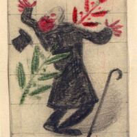 La figura de un anciano de cabellos, barbas blancas y traje negro se contornea con dolor al ser atravesado por una gran rama, cuyos extremos son verde en la parte de la espalda y roja (sangre) en su pecho. Un sombrero y un bastón pertenecientes al anciano caen a causa del movimiento. El dibujo está enmarcado y su superficie está cuadriculadaBoceto realizado para la ilustración de la revista Novelas y Cuentos: Titulo: Autor: Nº publc.: Fecha: TomoNC: PI/. 352