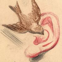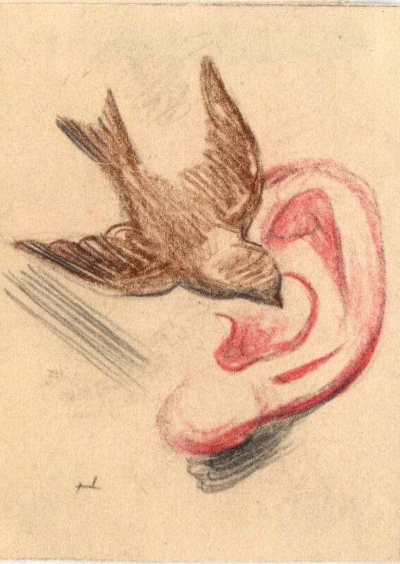 - Sobre un fondo claro una golondrina pequeña y de color castaño se acerca a un oído haciendo ligeros susurros. El boceto de la firma del pintor acompaña tan enternecedora imagen.Boceto realizado para la ilustración de la revista semanal Novelas y Cuentos. Titulo: La pista del gorrión. Autor: Darwin L. Teihet. Nº publicado: 974. Fecha: 08-01-1950. Tomo NC. 17