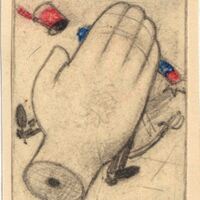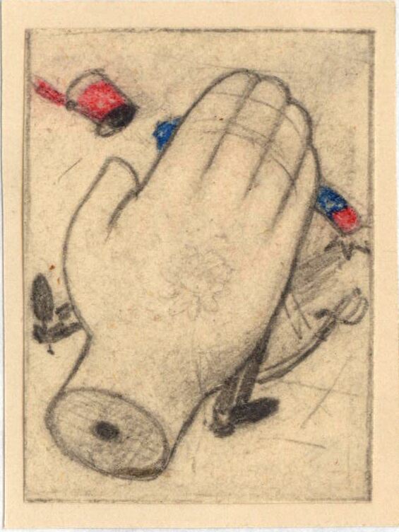 - Sobre fondo claro se muestra un dibujo enmarcado de una gran mano blanca con la silueta negra y seccionada por la muñeca que aplasta el cuerpo de un hombre del que apenas se vislumbran sus manos y pies. A su lado, un sombrero rojo militar.Boceto realizado para la ilustración de la revista semanal Novelas y Cuentos. Titulo: Autor: Nº publicado: Fecha: Tomo NC.