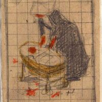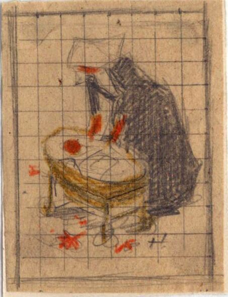 El dibujo enmarcado y cuadriculado se configura mediante dos figuras: una niñera, de pie, con traje largo, negro y sombrero de tres picos blanco meciendo la cuna de un bebé, segunda figura. Parece que el pintor ha realizado un boceto de su firma, en la parte izquierda, bajo los pies de la figura femenina.Boceto realizado para la ilustración de la revista Novelas y Cuentos: Titulo: Canción de cuna; Autor: Gregorio Martínez Sierra; Nº publc. 1324 Fecha 23 =9 1956; Tomo NC. 43 PI/. 230
