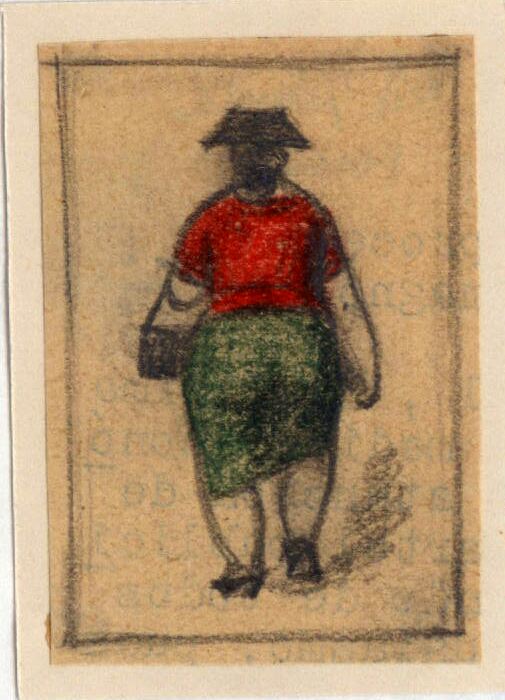 En este dibujo enmarcado pasea una mujer corpulenta de espalda llevando un bolso negro. Su falda es verde, su camiseta de manga corta es roja y su sombrero un tricornio de la guardia civil, y zapatos son negros.Boceto realizado para la ilustración de la revista semanal Novelas y Cuentos. Titulo: La pluma verde. Autor: Muñoz Seca y Perez Fernández. Nº publicado: 1188. Fecha: 14-02-1954. Tomo NC. 54.