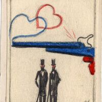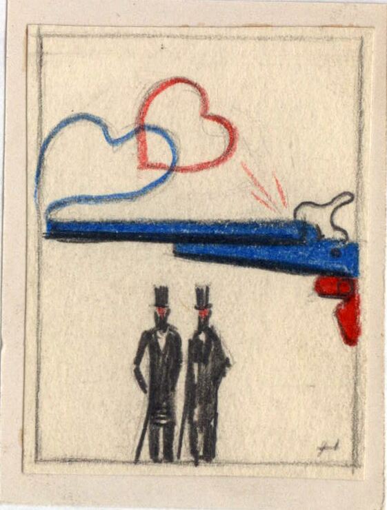 Una pistola en posición vertical dispara, ante la mirada de dos hombres estilizados de negro con bastón y sombrero situados en un plano más alejado, dos corazones cuyas siluetas son de color rojo y azul. En el dibujo enmarcado parece adivinarse el boceto de la firma del artista.Boceto realizado para la ilustración de la revista semanal Novelas y Cuentos. Titulo: Un amor trágico. Autor: Eugenio Onieguín. Nº publicado: 1223. Fecha: 17-10-1954. Tomo NC. 33