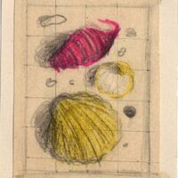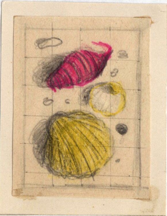 Sobre un fondo claro y cuadriculado este dibujo enmarcado representa tres conchas del mar. Una es rosa y pequeña, otra es amarilla y más grande que la anterior y otra con el revés blanco.Boceto realizado para la ilustración de la revista semanal Novelas y Cuentos. Titulo: Las conchas purpureas. Autor: R. L. Goldman. Nº publicado: 1153. Fecha: 14-06-1953. Tomo NC. 43.