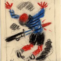 En este dibujo enmarcado y firmado por su autor un niño, que aparece de espalda, se retuerce al ser atravesado por el filo de una balloneta cuyo mango parece el de una escopeta. Su traje es un pantalón corto de color negro, una camiseta a rayas blancas y azules y zapatos oscuros.Boceto realizado para la ilustración de la revista semanal Novelas y Cuentos. Titulo: Muy reservado. Autor: Nevil Shute. Nº publicado: 1135. Fecha: 08-02-1953. Tomo NC. 44.