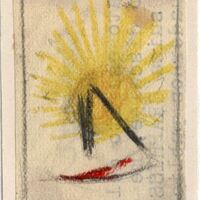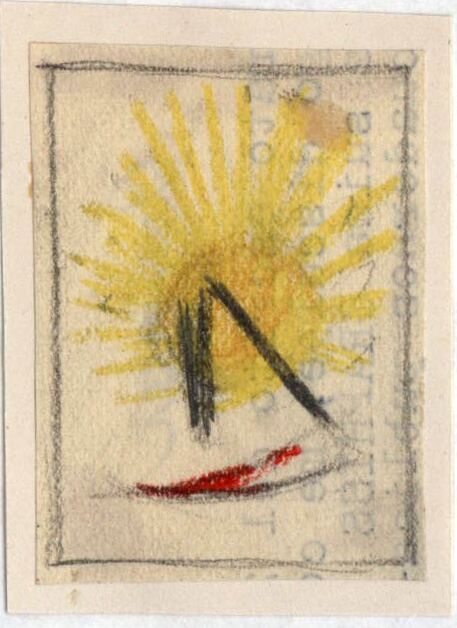 En este dibujo enmarcado el tema central lo constituye la figura de un gran sol con sus enormes rayos de luz amarilla. Dos líneas de color negro, superpuestas, y una mancha roja, por debajo, acompañan al sol brillante.Boceto realizado para la ilustración de la revista semanal Novelas y Cuentos. Titulo: Amanecer. Autor: S. Fowler Whright. Nº publicado: 1175. Fecha: 15-11-1953. Tomo NC. 59.