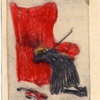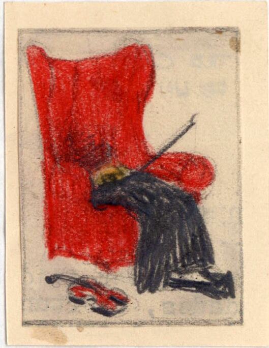 En este dibujo enmarcado se ve la figura de un hombre de traje negro arrodillado y escondiendo su cabeza en el asiento de un sofá enorme con orejas de color rojo. De la figura del hombre sobresale un arco y caído en el suelo hay un violín.Boceto realizado para la ilustración de la revista semanal Novelas y cuentos. Titulo: Tres caras de un alma. Autor: Lucia Delarve-Mardrus.Nº publicado: 1038. Fecha: 01-04-1951. Tomo NC. 45.