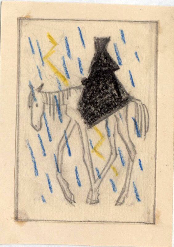 Bajo una tempestad de tormenta y lluvia intensa, adivinada por las pequeñas manchas azules en forma de lágrima y el rayo amarillo, cabalga un jinete con una larga capa negra sobre un caballo escuálido de color blanco con las patas muy altas. La figura en este dibujo enmarcado aparece de perfil.Boceto realizado para la ilustración de la revista semanal Novelas y Cuentos. Titulo: El fantasma del Dique. Autor: Teodoro Storn. Nº publicado: 1096. Fecha: 11-05-1952. Tomo NC. 44.