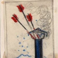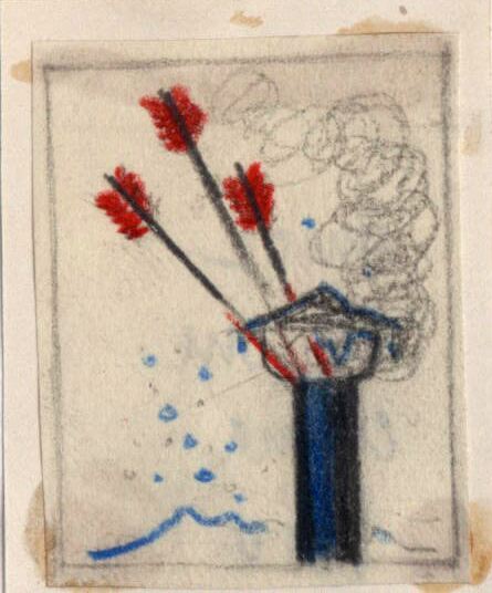 Una chimenea azul, alta y en forma cilíndrica de la que sale humo, es usada como depósito para tres flechas grandes y rojas. Manchas negras y azules rodean al objeto en este dibujo enmarcado.Boceto realizado para la ilustración de la revista semanal Novelas y Cuentos. Titulo: Amor en un clima frio. Autor: Nancy Mitford. Nº publicado: 1208. Fecha: 04-07-1954. Tomo NC. 49.
