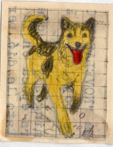 En este dibujo enmarcado y de superficie cuadriculada destaca la imagen de un perro de frente amarillo con manchas negras. Lleva la boca abierta. Detrás del dibujo parecen transparentarse algunas letras en tonos azules y en posición vertical de la cara de atrás del papel.Boceto realizado para la ilustración de la revista semanal Novelas y Cuentos. Titulo: La llamada de la selva. Autor: Jack London. Nº publicado: 1060. Fecha: 02-09-1951. Tomo NC. 60.
