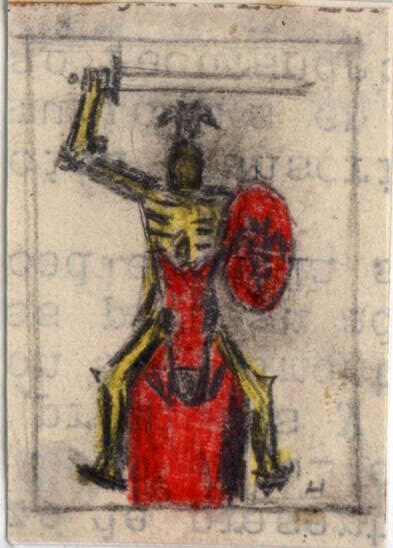 Un boceto de la firma del pintor acompaña esta imagen enmarcada en la que se ve de frente a un guerrero esqueleto con su casco sobre un caballo cubierto por una manta roja. En su mano derecha empuña una espada y en la izquierda lleva un escudo redondo de color rojo con algo dibujado en negro.Boceto realizado para la ilustrqacion de la revista semanal Novelas y Cuentos. Titulo: El castillo peligroso. Autor:Walter Scott. Nº publicado: 1182. Fecha: 03-01-1954. Tomo NC. 46 y 54.