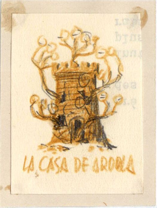 - Sobre un fondo muy claro este dibujo enmarcado lleva el título de “la casa de Arorla”. La imagen que se muestra es un torreón del que salen, por ventanas y puertas, grandes ramas. El color que predomina en todo el dibujo es el amarillo.Boceto realizado para la ilustración de la revista semanal Novelas y Cuen tos. Titulo: Autor: Nº publicado: Fecha: Tomo NC.