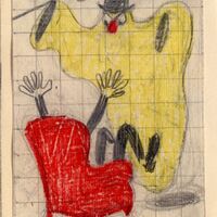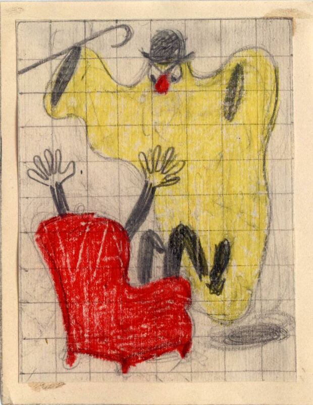 - Un fantasma sin manos, con una túnica amarilla, sombrero negro y bastón da un buen susto a un hombre que se encuentra sentado en su sillón rojo del que solamente se ven sus manos y piernas en gran agitación a causa del miedo. El dibujo se halla enmarcado y sobre una superficie cuadriculada.