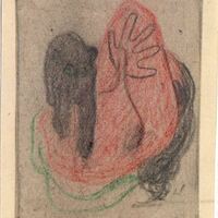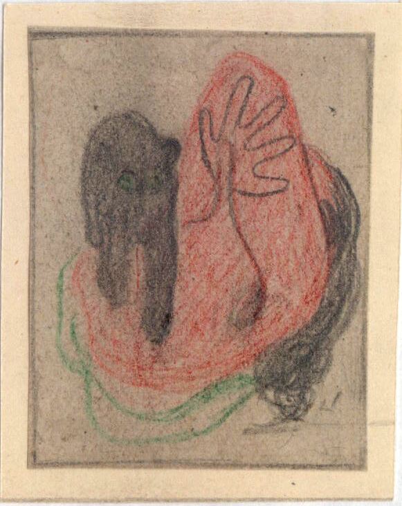 Varias manchas de color rojo y negro y líneas verdes se unen para formar este dibujo sin la presencia de formas definidas a excepción de una mano con silueta negra sobre la mancha roja. El dibujo está enmarcado y su fondo es algo oscuro. Muy sutilmente se puede vislumbrar el boceto de la firma del pintor hacia la izquierda inferior.Boceto realizado para la ilustración de la revistga semanal Novelas y Cuentos. Titulo: Autor: Nº publicado: Fecha: Tomo NC.: