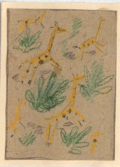 En un paisaje natural adivinado por los pequeños matorrales que crecen en el suelo, corren un buen grupo de jirafas de color amarillo con manchas negras. El dibujo está enmarcado.Boceto realizado para la ilustgracion de la revista semanal Novelas y Cuentos. Titulo: Cazadores de jirafvas. Autor: Maine Reid. Nº publicado: 1065. Fecha: 07-10-1951. Tomo NC.: 45.